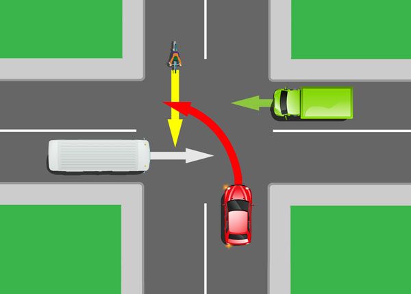 Los giros no protegidos en las intersecciones son más comunes que los giros protegidos. Cuando des una vuelta no protegida sin una señal de flecha verde, DEBES ceder el paso a los automovilistas que se aproximan, a los ciclistas y a los peatones que desean cruzar la intersección. Los conductores deben ejecutar un giro no protegido cuando el semáforo verde fijo está activo, teniendo cuidado de ceder el paso al tráfico que se acerca en la dirección opuesta. Algunas veces encontrarás señales que te recuerdan que debes ceder el paso antes de doblar. Por ejemplo: “PARA DOBLAR A LA IZQUIERDA CEDER EL PASO EN VERDE”