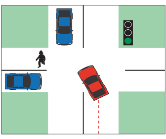 A menos que estés haciendo un giro a la izquierda protegido por un semáforo de flecha verde, debes ceder el paso al tráfico que se aproxima y a los peatones que cruzan la carretera.